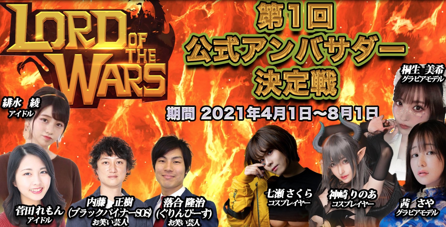 尚、2021年4月1日 ~ 8月1日の期間中、ロード・オブ・ザ・ウォー1年間の公式アンバサダーをかけてアイドルやコスプレイヤー、お笑い芸人たちの熱い戦いが繰り広げられています。 公式アンバサダーに選ばれるのは誰か、注目ですね👀