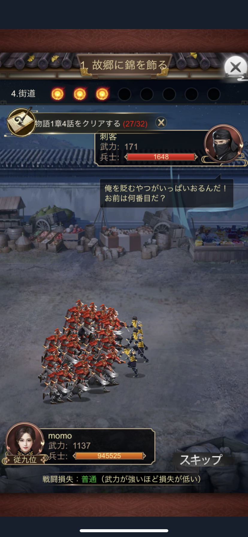 スキップ機能は課金をしないと有効になりませんのでご注意くださいね。バトル演出がリアルで楽しいので、私はとくにスキップしなくてもいいかなという感じですが、スキップできればかなり効率よく物語を進められると思います。