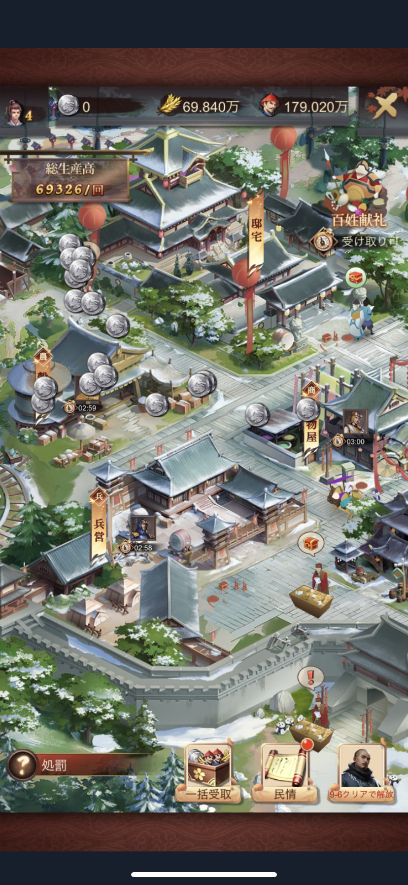 封地において穀倉や銀山、兵営を営んだりすることで、資源や兵士を増やすことができますよ。経営建築を昇級させたり、やることが沢山あるので面白いです。一括受取ボタンがあるのもユーザー目線でよく考えられていて便利で良いですよね。
