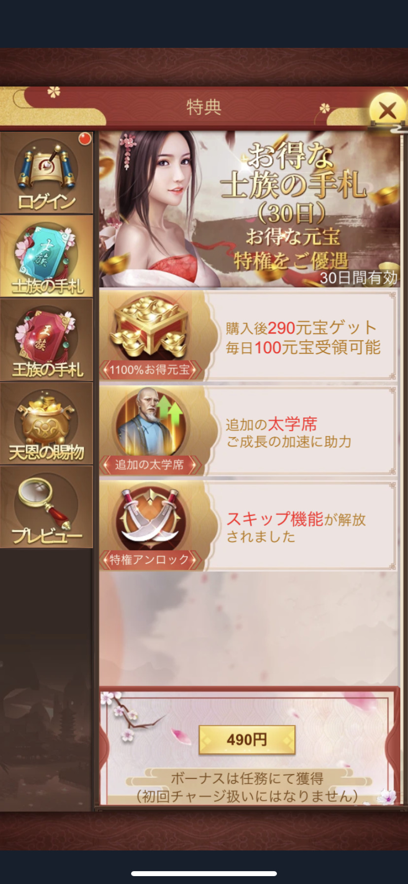『日替わり内室』では、士族の手札がとてもお得なのでおすすめです。30日間有効で、お得に元宝を得ることが出来るんですよ。さらには物語における戦いのスキップ機能が解放されます。どんどん物語を進めていけるので時間短縮になりますね!