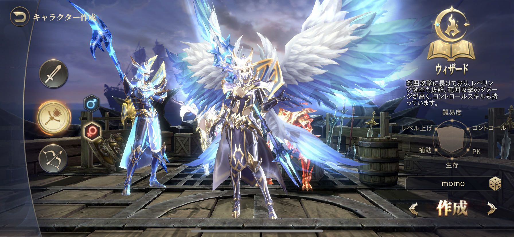 ナイト、ウィザード、エルフの三大クラシックジョブに女性キャラも加わったことで、より多くの方が楽しめる作品となっております。私はウィザードを選択しました。範囲攻撃に長けていて、レベル上げもし易い印象を受けました。