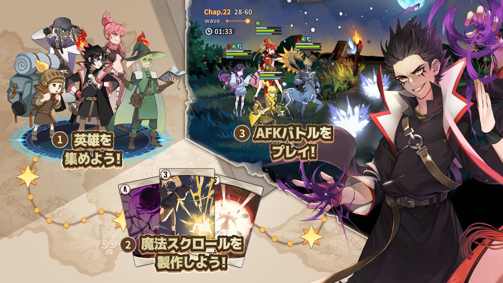 『ジオ:魔法スクロール商人』では、英雄を集め、魔法スクロールを作成したり、バトル以外にも楽しみがあります。戦闘で使える魔法スクロールは3枚のみなので、どれを選ぶかも戦略となり、楽しさがあります。本作は、LINEマンガに人気連載中のwebマンガ『魔法スクロール商人ジオ』の興味津々なストーリーと世界観をゲーム内に具現化しています。