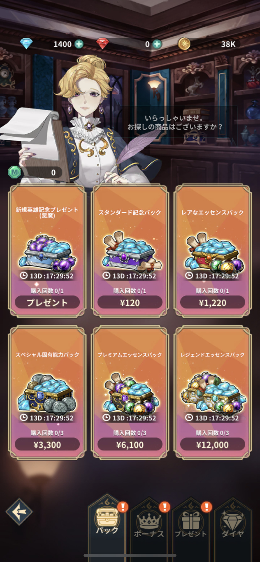 『ジオ:魔法スクロール商人』では、ダイヤ購入の前に、ぜひパックをご覧ください、購入に当たって個数や時間の制約はありますが、お得なパックが沢山あります。新規英雄記念プレゼントなんて、無料でいただけますよ!