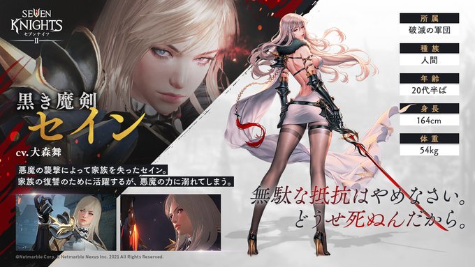 『セブンナイツ2』は、世界で6,000万人がプレイした[セブンナイツ]の正統な後継作品である、映画のようなグラフィックが美しいRPGです。キャラクターデザインも大変魅力的で、本作を盛り上げています。私は、セインと言うキャラクターが好きです。悪魔に家族を奪われて、聖十字団に救助され、悪魔を滅ぼすために悪魔の力を移植された過去を持つという、セイン。彼女の影のある物語、雰囲気に魅力を感じました❤