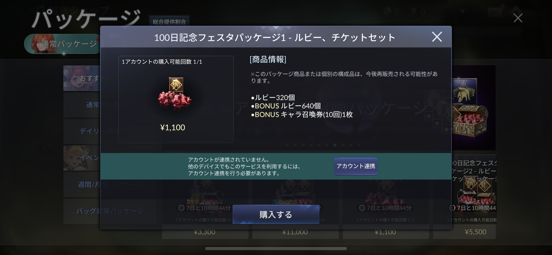 『セブンナイツ2』では、課金するにあたって、お得なパッケージがございます。ぜひそちらのパッケージをご注目ください。今ですと、100年記念フェスタパッケージ1-ルビー、チケットセットが大変お得です。