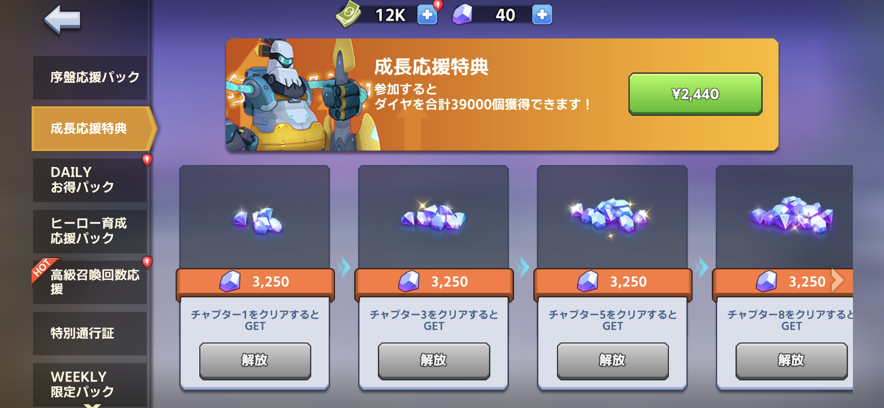 チャプターをクリアしていくことにより、ダイヤが解放されていきます。どんどんチャプターを進めたくなる、成長応援特典は本当に素晴らしいシステムです。