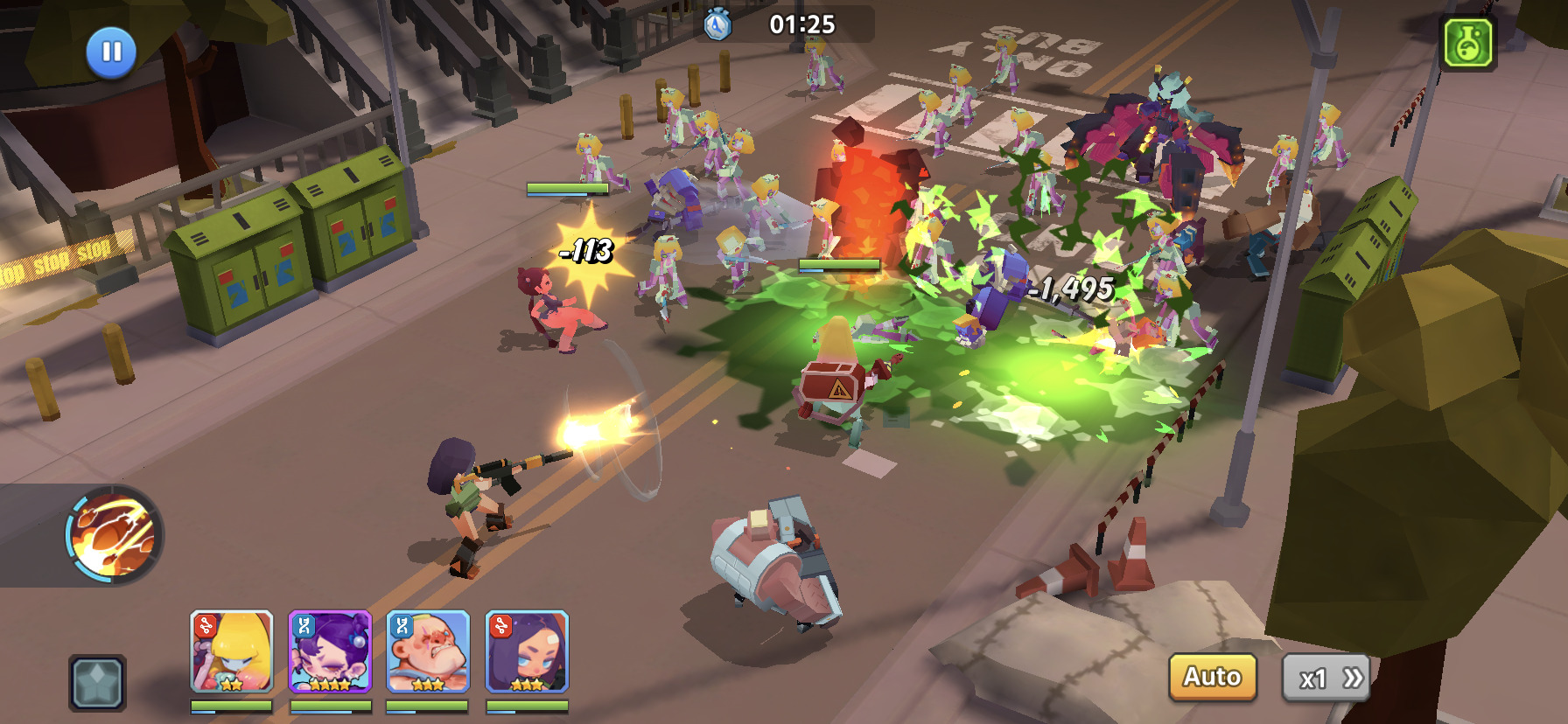 本作『いけー!放置戦士』では、英雄を最大5人まで選びパーティを編成します。この5人で挑む、ステージでのバトルがとにかく魅力的ですよ!バトルアクションも御覧の通り、臨場感があり、迫力がある演出が素晴らしいです。3Dキャラクターがフィールドで敵を圧倒していくところを見ると爽快ですよ!