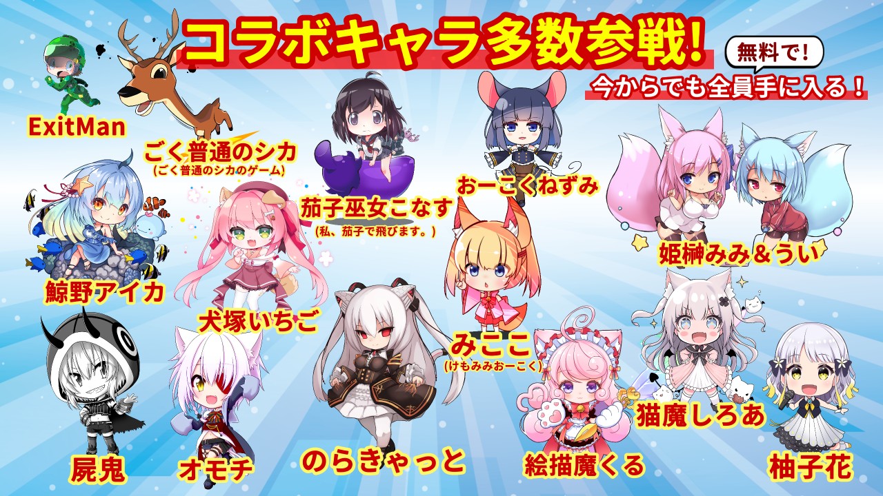 伝説の個人Vtuber、のじゃおじさんこと「みここ」さんや、「のらきゃっと」や絵描魔くる、柚子花、屍鬼などもコラボ参戦中です。ごく普通のシカのゲーム DEEEER Simulator から、「普通のシカ」、私、茄子で飛びます。から、「茄子巫女こなす」も仲間にすることができます!