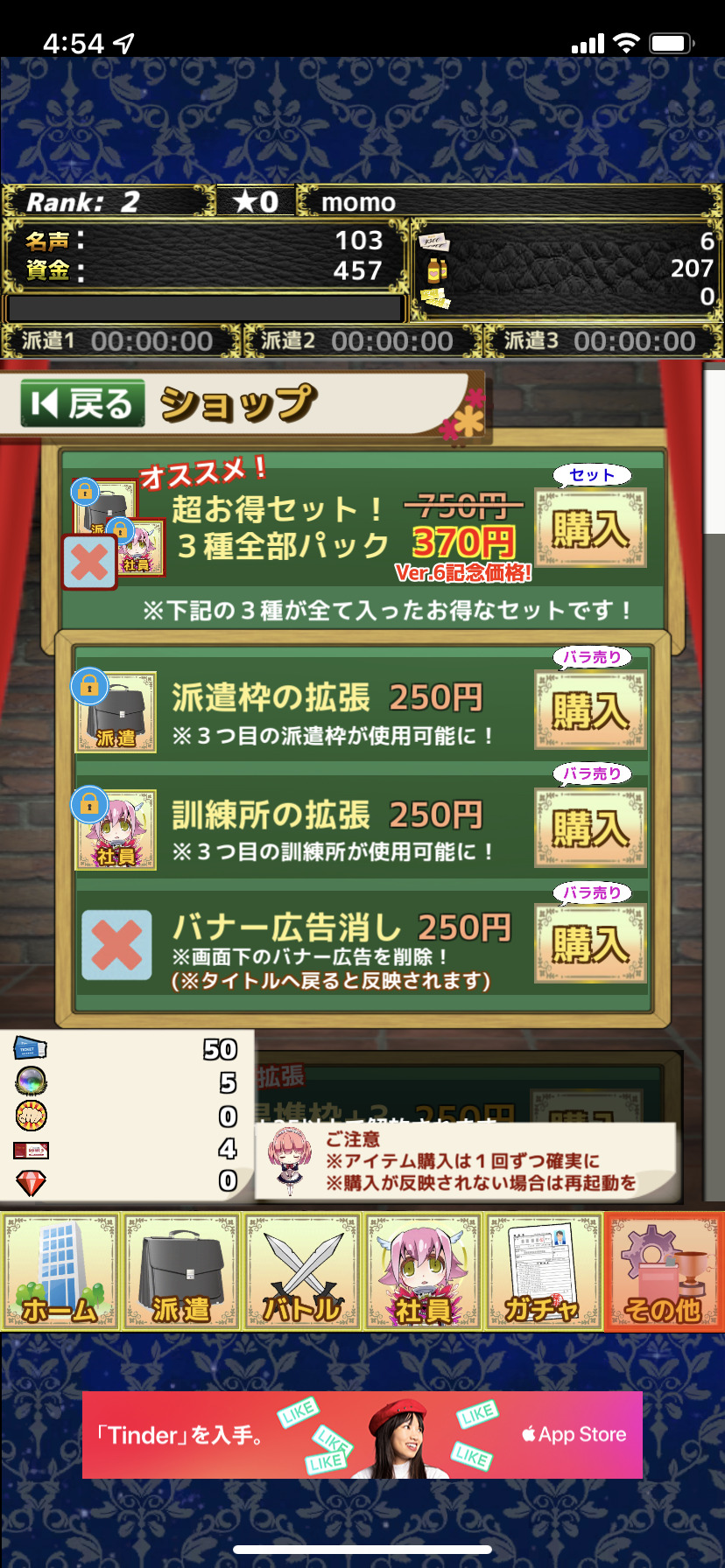 『モンスターカンパニーVer.6』では、超お得セットなるものがあります。3種全部パックというものです。派遣枠の拡張、訓練所の拡張、バナー広告消しの3種すべてが入って、370円という限定価格です!通常750円ですからかなりお得ですね!バナー広告が消えるのも良いですよね。これは自信をもって購入をオススメできるお得なパックです。