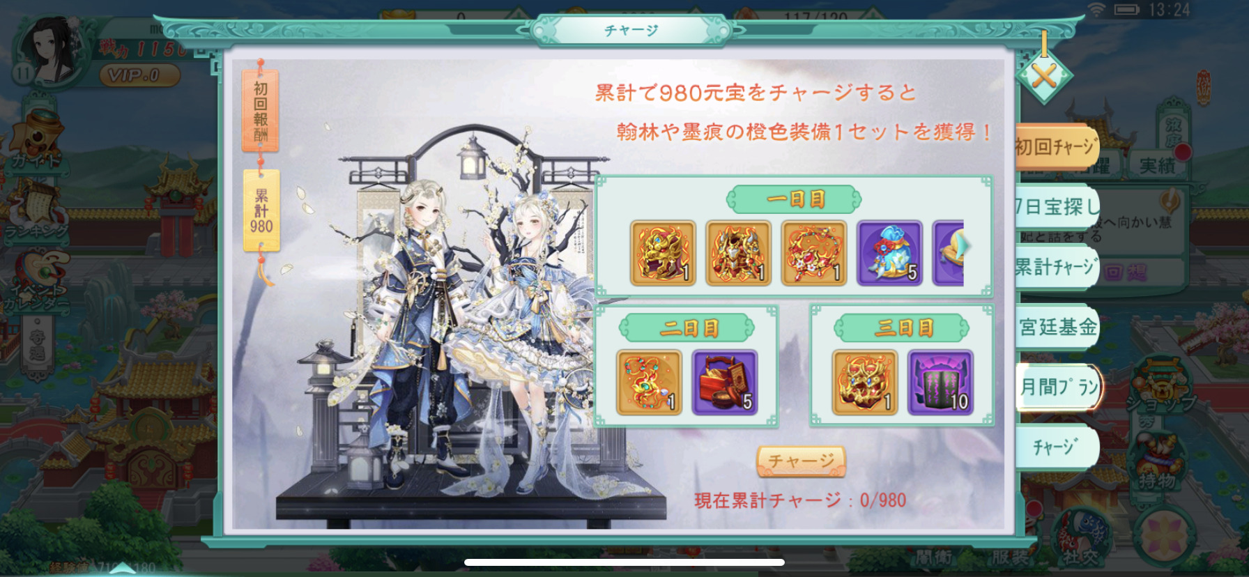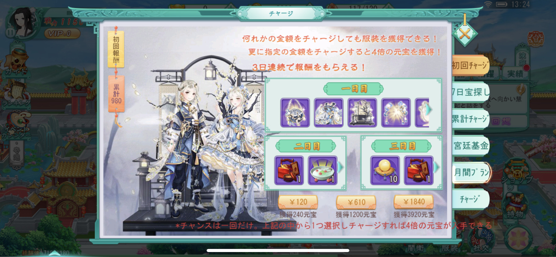 『宮廷女官』では、初回チャージが大変豪華なんです!任意の金額をチャージするだけで素敵な服装をGET出来ちゃうんですよ。さらに、指定の金額をチャージすることで、4倍の元宝が貰えるんです。