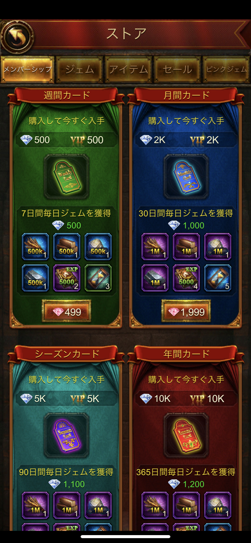 メンバーシップには、週間カード、月間カード、シーズンカード、年間カードというものがあります。それぞれ決まった期間の間、毎日ジェムが貰えたり、豪華な報酬をGETすることができるんですよ!ぜひ課金を考えている方はこちらを利用してみて下さいね!