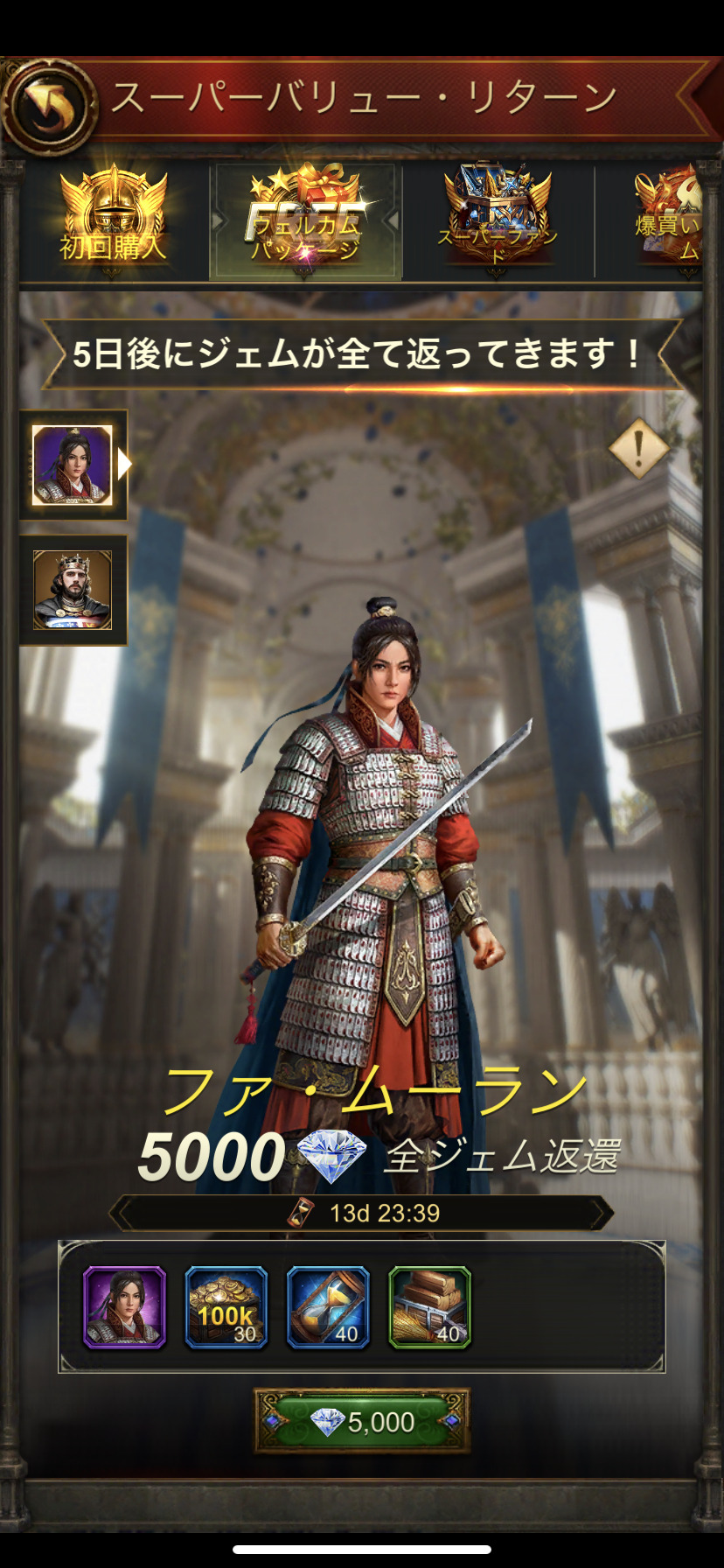 スーパーバリュー・リターンも凄くお得だと思いました。5日後にジェムが全て戻ってくるって、、、もはや無料みたいなものですよね❤ファ・ムーラン、かっこいいです。
