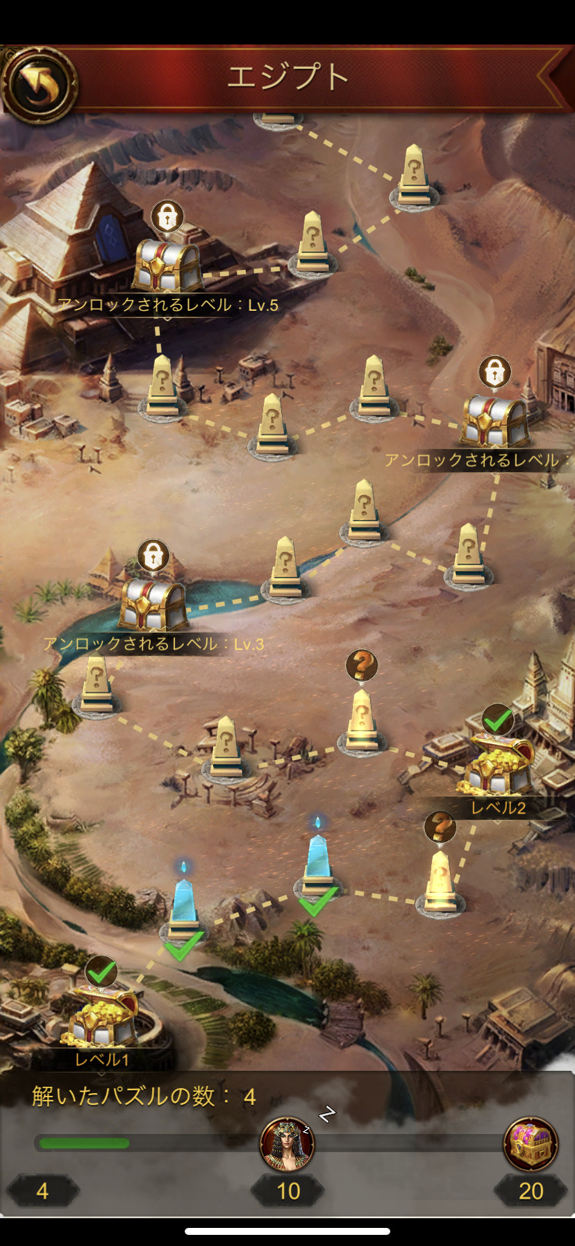 パズルの雰囲気もステージごとにことなります。エジプトステージのパズルはなんだかピラミッドの内部のような、神秘的でいて、怪しい雰囲気があるところが魅力的だと思いました。パズルの難易度も簡単過ぎず、難し過ぎず、本当に良いバランスです!