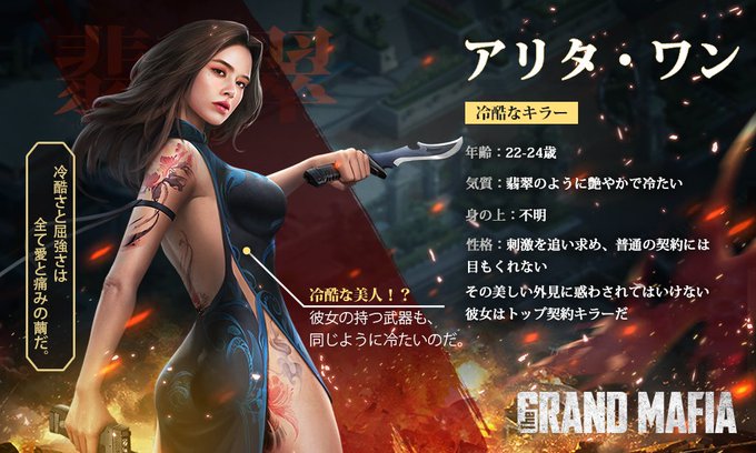 『ザ・グランドマフィア』では登場キャラクターもとても魅力的ですよ!個人的にはアリタ・ワンが素敵だなって感じました!冷酷さを持つ美女、謎めいていますね。彼女を翡翠へと磨き上げたその人は、もうこの世にはいないそうです。でも、アリタ・ワンの心の奥深くで永遠に生き続けているってなんだかステキですね。