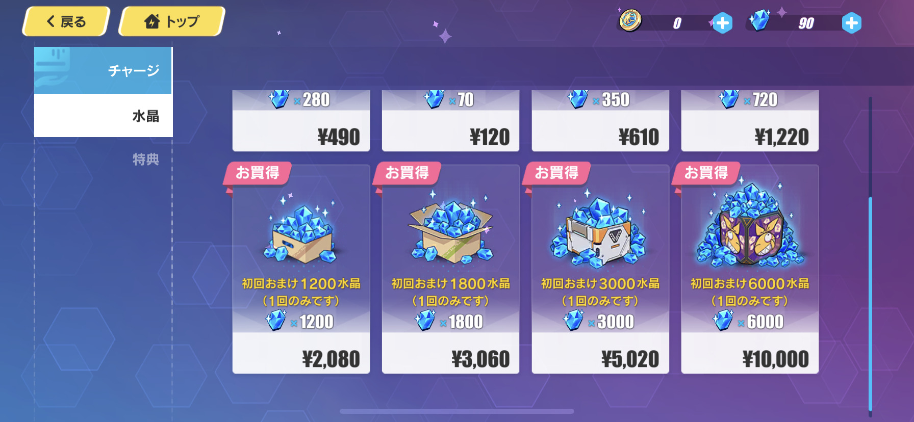 『崩壊3rd』では、水晶が課金要素となっています。初回おまけがあるのがお得ですね。初回おまけを利用してかしこく課金して、本作を楽しく進めていきましょう!