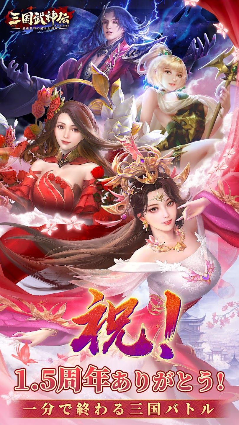 『三国武神伝~最強名将の成り上がり~』では今年の4月15日に1.5周年を迎えました。その記念として、毎日ボーナス、周年記念祭りと美人イベントを含む盛大な記念イベントが開催されております!