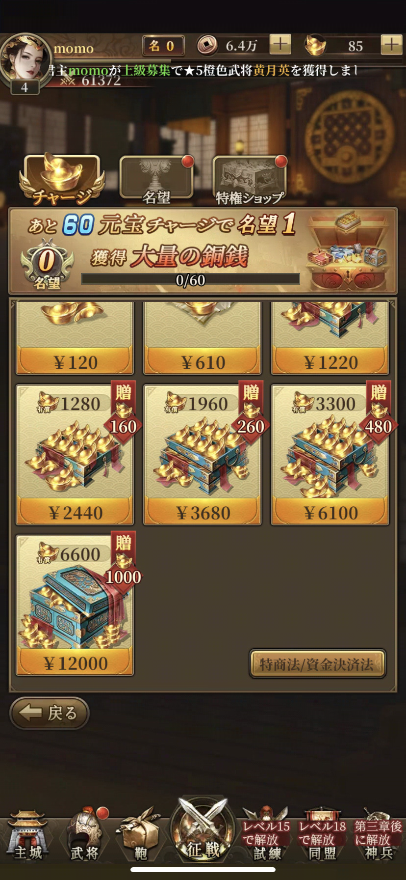 元宝をチャージすることで、名望というものを上げられ、豪華な報酬もさらに得ることができますよ!