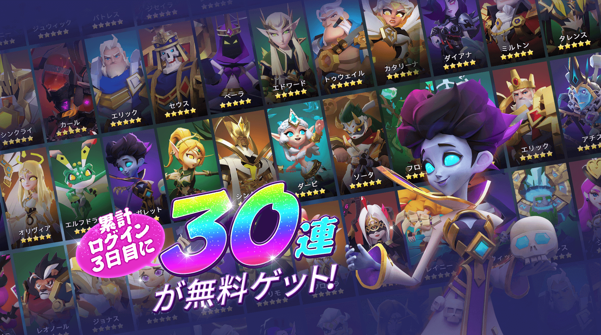 『ベイラーレジェンド』では日本版リリース記念として、プレイヤーはログインしてから3日目に『ガチャ30連』が無料でもらえます。30連が無料だなんてすごく嬉しいですよね。ぜひガチャ30連でお気に入りの英雄をGETしましょう。