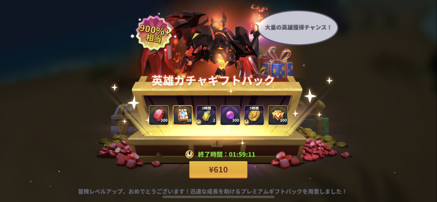 例えば英雄ガチャギフトパックがあります。610円で900%相当という大変お得な内容となっていますよ。英雄を大量に獲得できるチャンスがあります。