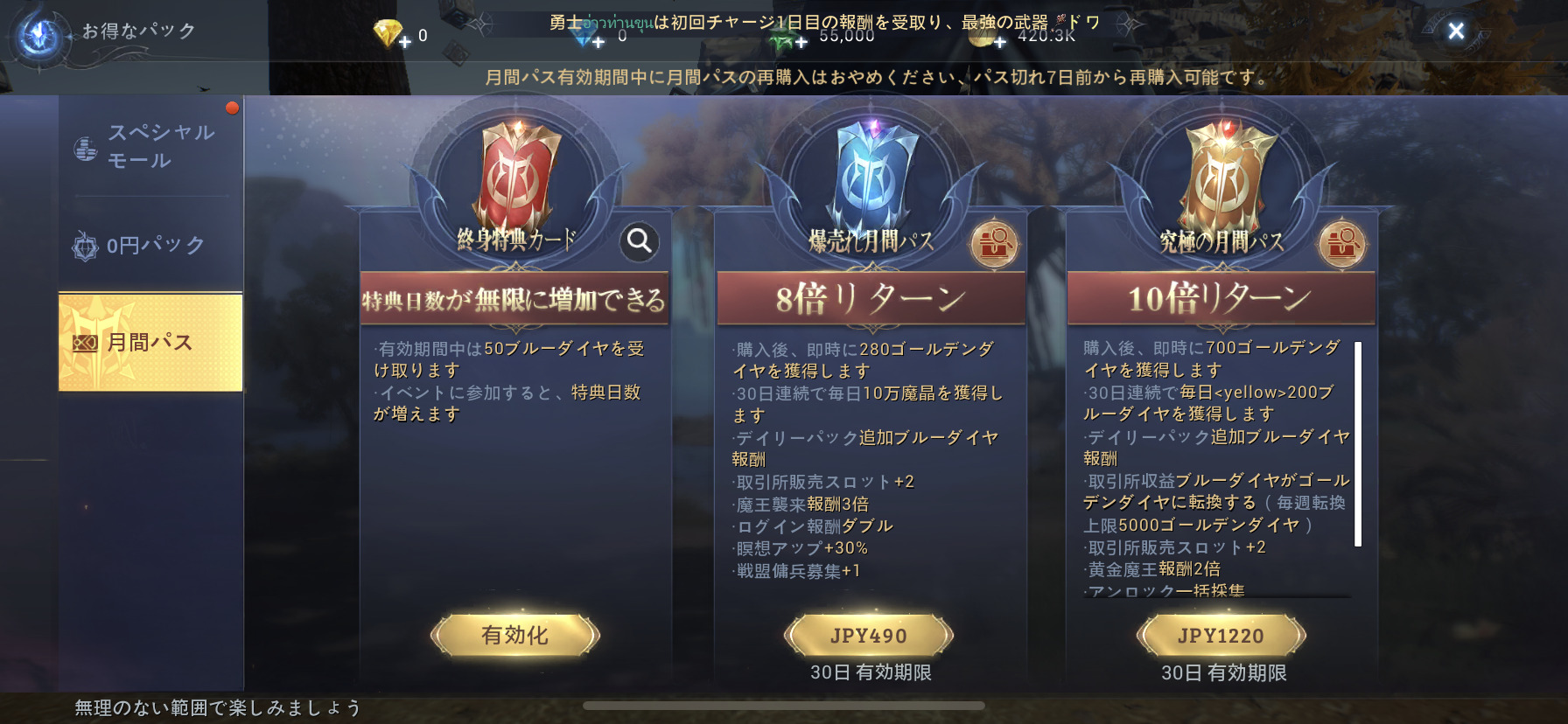 購入後に即時に700ゴールデンダイヤを獲得でき、30日連続で毎日200ブルーダイヤを獲得できるんです。さらに豪華な特典が付いてきます。究極の月間パス、ぜひチェックしてみてくださいね。本作をかなり優位に進められますよ♪