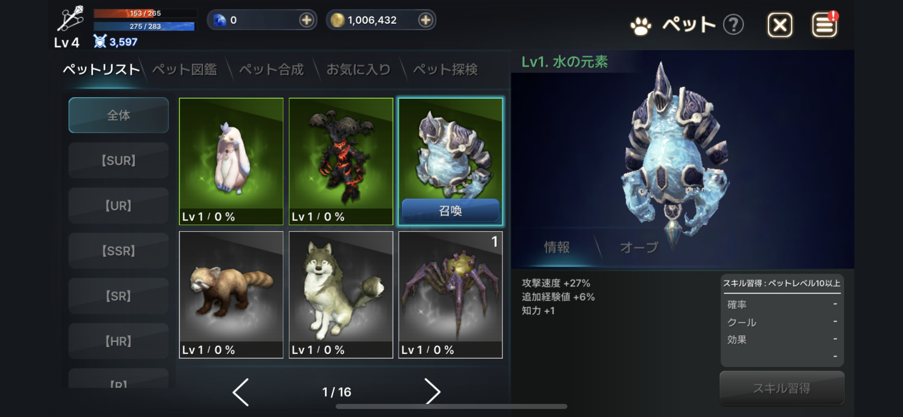 私は水の元素というペットを召喚して冒険のお供にしています。水の元素を連れていることで、攻撃速度+27%、追加経験値+6%、知力+1の恩恵があります。どんどんレベルも上げていきたいなと思います。