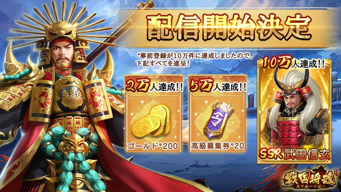 『戦国将魂 天下統一の道へ』では、事前登録が10万件に達したため、ゴールド×200、高級募集券×20、そしてSSR武田信玄を貰えるんです。かなり嬉しい特典ですよね。