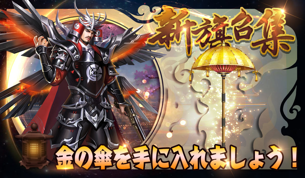 『戦国将魂 天下統一の道へ』ではイベントも充実しています。イベント【新旗召集】では、新UR戦旗――金の傘が登場しています。 ぜひお見逃しなく! 「新旗召集」イベントが終了して一定の期間後、金の傘が通常の「戦旗召集」に追加されるとのことです。