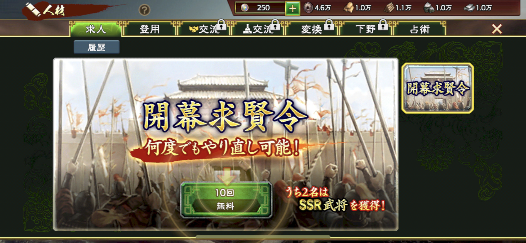 チュートリアルにて、10連無料でガチャを引けます。何度でもやり直し可能です。2名はSSR武将が必ずGETできますよ。かなり太っ腹ですよね👀!