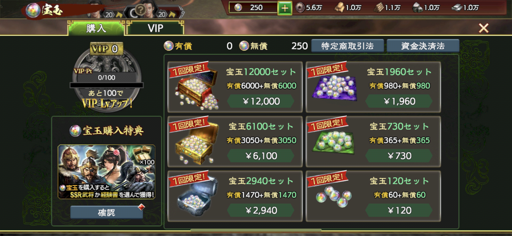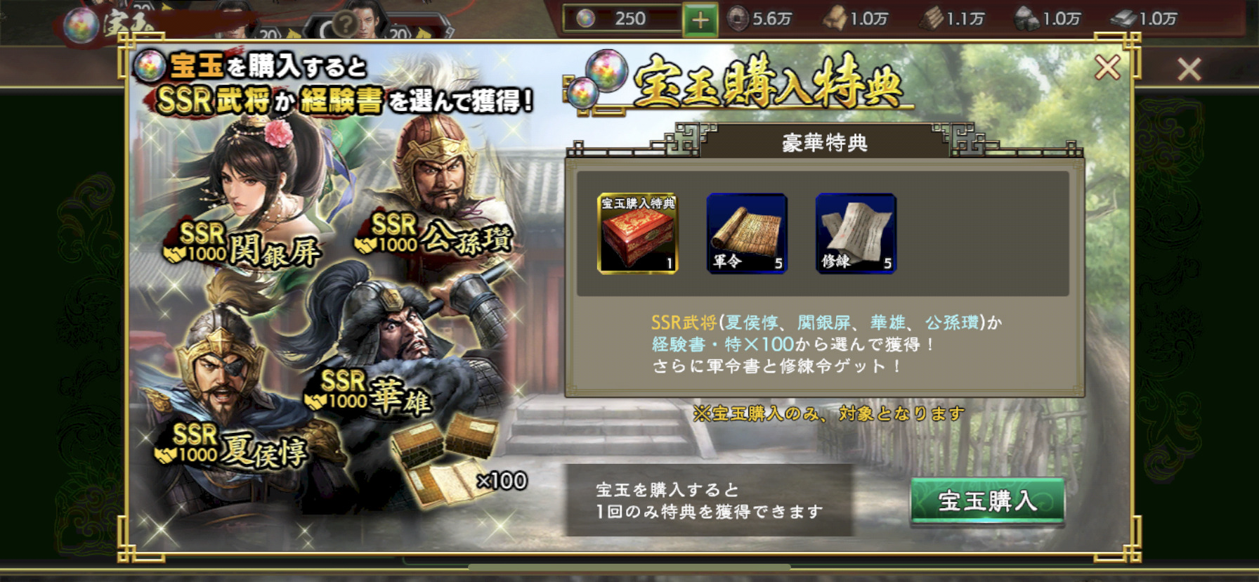 宝玉を購入することで、初回に、SSR武将か経験書を選んで獲得できます。かなり豪華な特典で魅力的ですね。