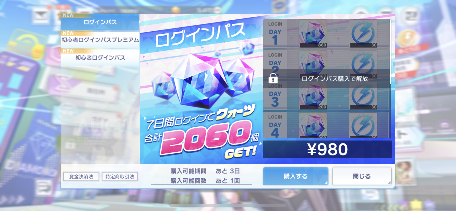 7日間ログインでクォーツを合計2060個も獲得出来るんです。これで980円とはかなりお得だと思います。