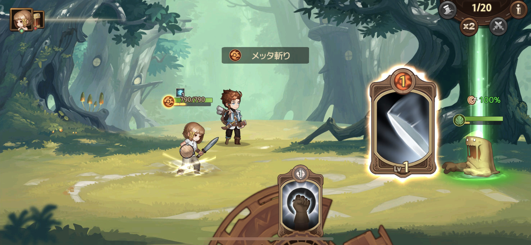 本作『ラビリンス・ブレイブ』では、スキルカードを使うバトルが楽しいです。画像の「メッタ斬り」などがスキルカードです♪