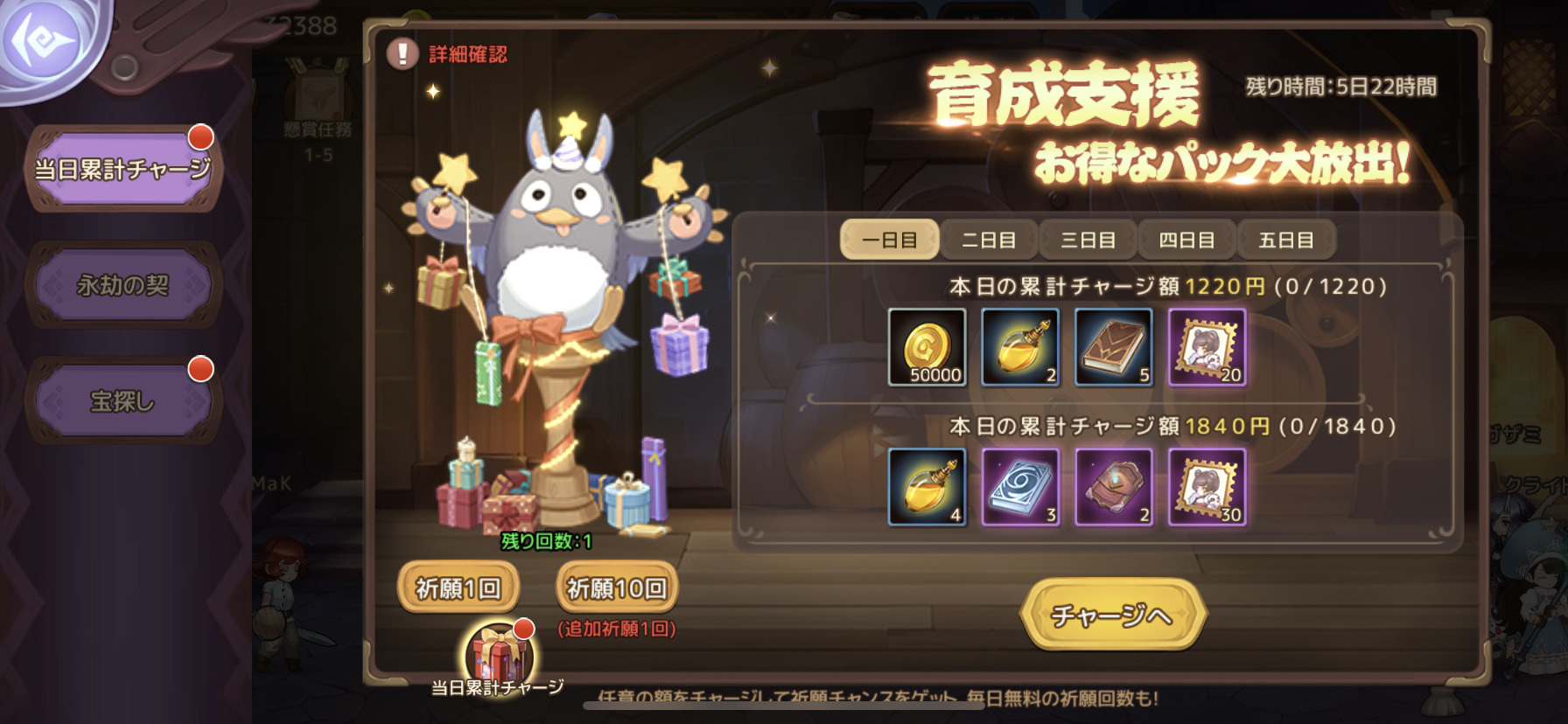 育成支援のお得なパックをぜひチェックしてみてくださいね。累計チャージ額に応じて豪華な報酬をGETできますよ。