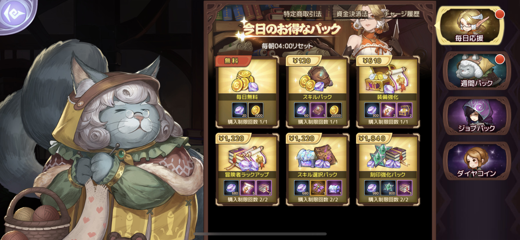 『ラビリンス・ブレイブ』では、お得なパックがたくさん用意されています。例えば今日のお得なパックとして用意されている、スキルパックや装備強化、冒険者ランクアップなどです。目的に応じてパック名称が分かり易いのも良いですよね。スキルパックの価格なんてかなりお手頃です。