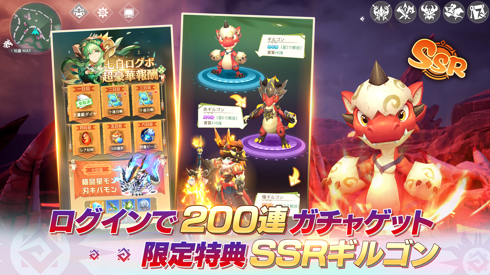 『モリノファンタジー:世界樹の伝説』をスタートするにあたって、かなり豪華な報酬を貰えます。事前登録者数が777,777人突破を記念して、ユーザー全員に豪華報酬が配布されますよ。 SSR星モン「ギルゴン」をはじめとして、藍ダイヤ500個、星モン抽選券10枚などがもらえてしまうんです!また、ログインで200連ガチャをGETできます。さあ、始めるなら今がチャンスです。ガチャを引いて、冒険で一緒に戦ってくれる強い星モンを入手しましょう。