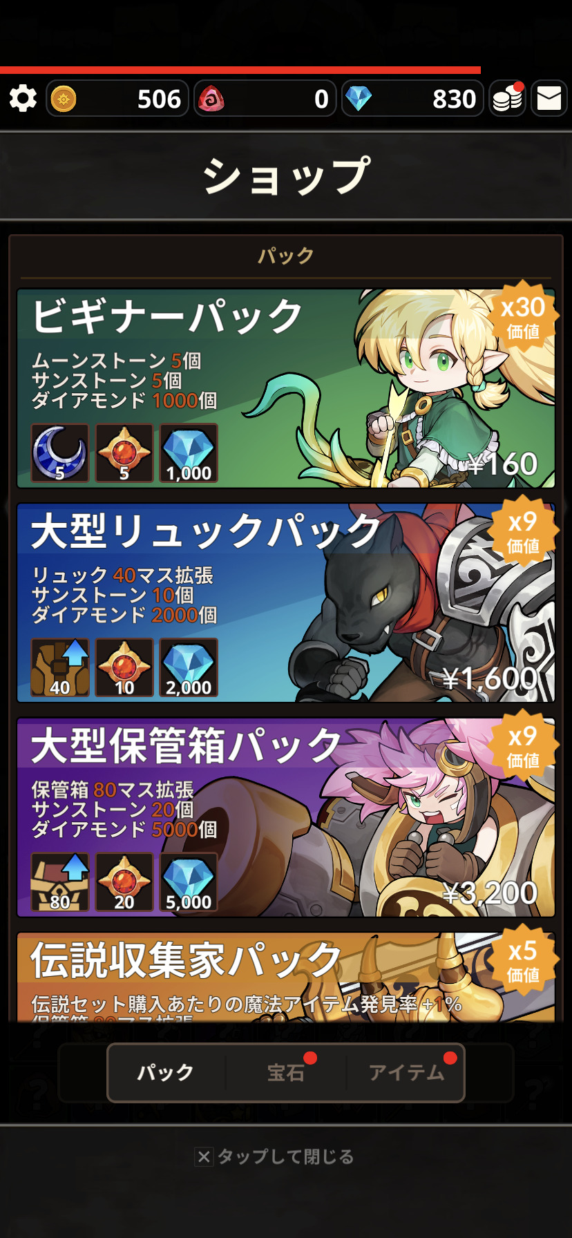 『ループダンジョン』では、ショップにお得なパックがたくさん用意されています。