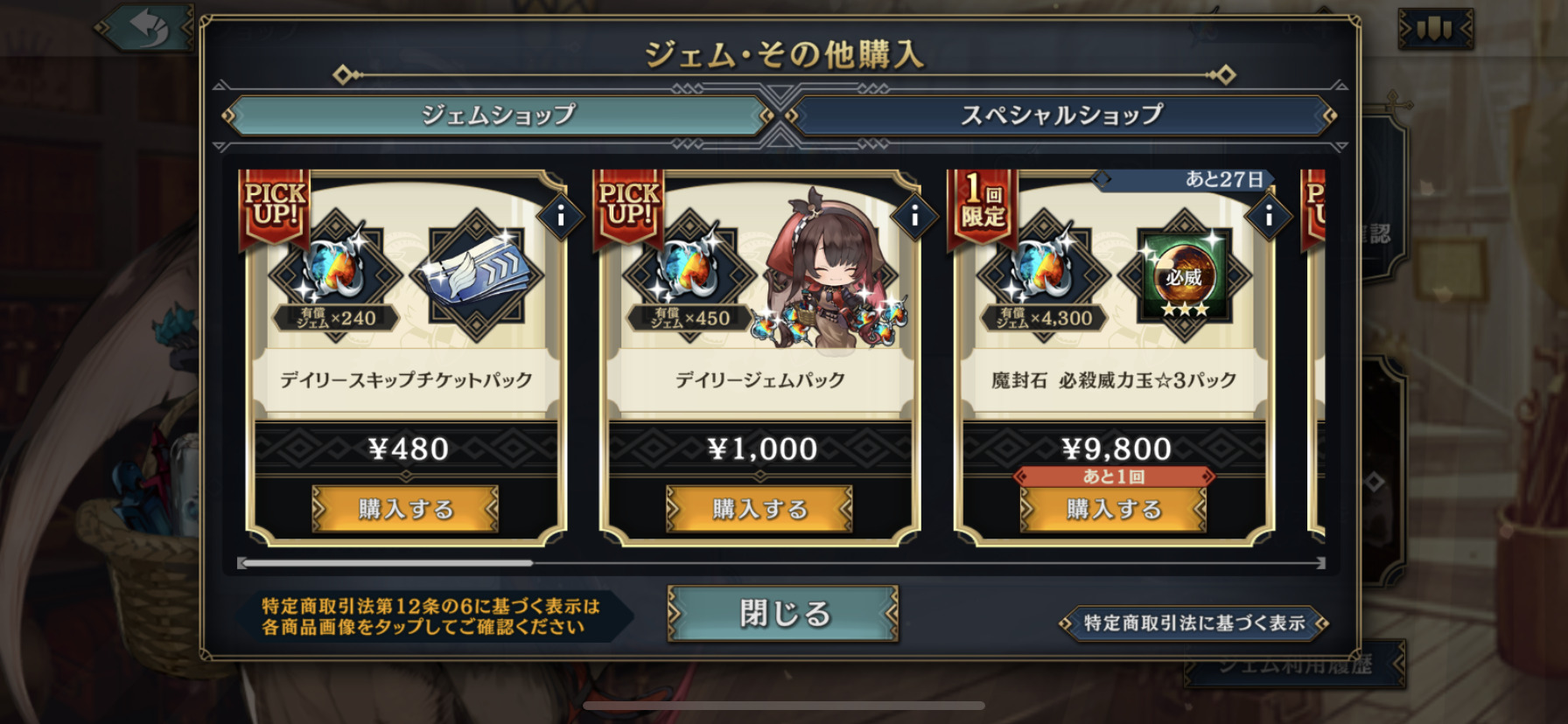 デイリースキップチケットパックやデイリージェムパック、かなりお得な内容になっています。スキップチケットもかなり便利ですよね。私はレベル上げでかなり多用しています。