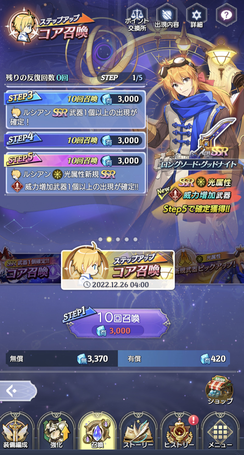 ステップアップコア召喚だと欲しい武器を確実にGETできるから良いですよね。STEP5になれば、ルシアン光属性新規SSR威力増加武器1個の出現が確定するんです!