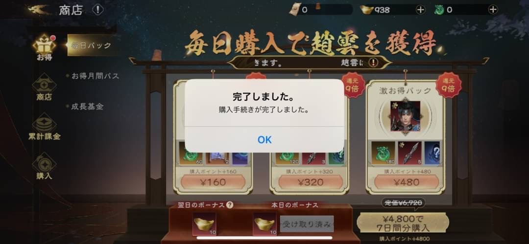 こちらのパックを利用することでお得に趙雲の欠片を集めることができます。ちなみに7日間分購入は4800円という価格です。定価は6720円のなのでかなりお得ですよね。毎日パック、ぜひ皆さんもチェックしてみてくださいね。