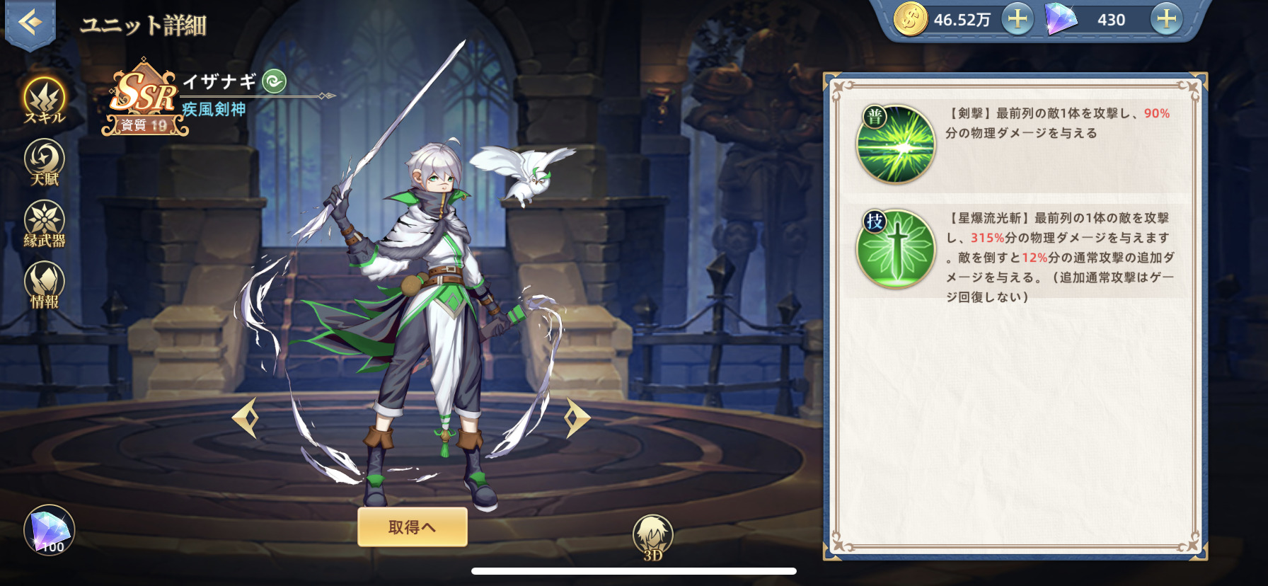 スキルには、剣撃があり、最前列の敵一体を攻撃し、90%の物理ダメージを与えます。