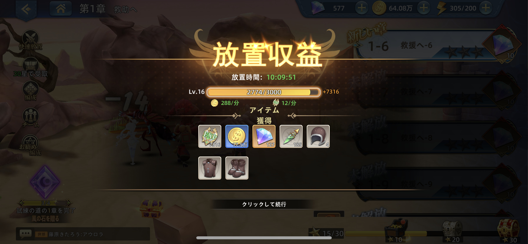 時間がない時もタップのみの簡単プレイができ、いきなり戦闘スキップでサクっと進める【サクッと機能】で楽々プレイできるところも本作の良い所だと思いました。