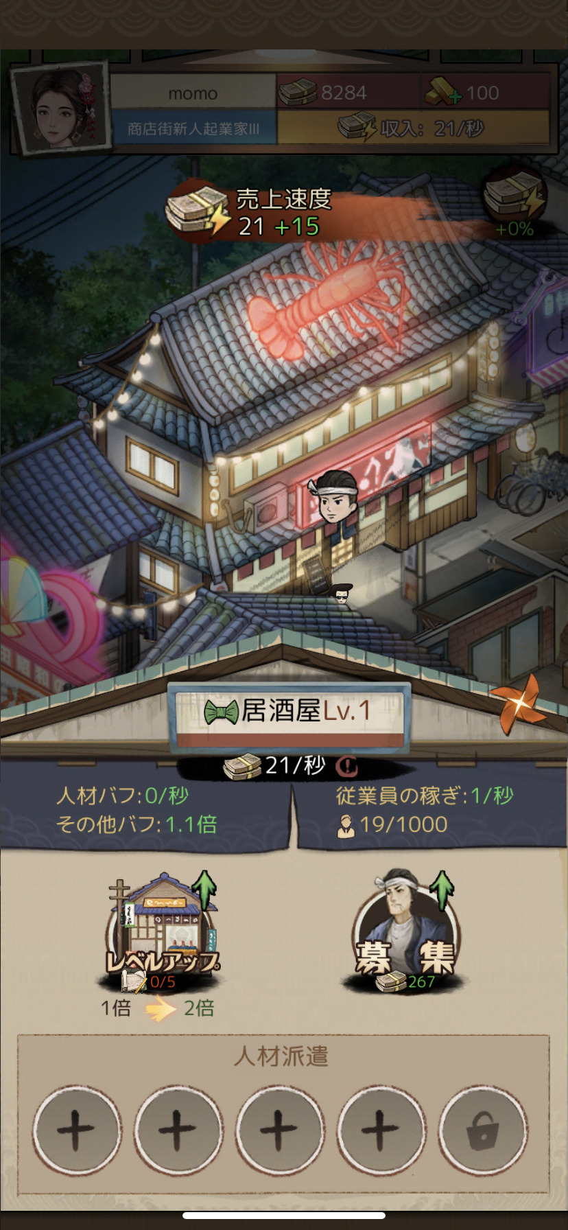 チュートリアルもそこまで長くなく、簡単にゲームシステムを理解できますよ!居酒屋や映画館など、懐かしいお店を経営することができます。人材を募集したり、建物をレベルアップしたり、人材派遣したり、やり込み要素も充実している印象です。