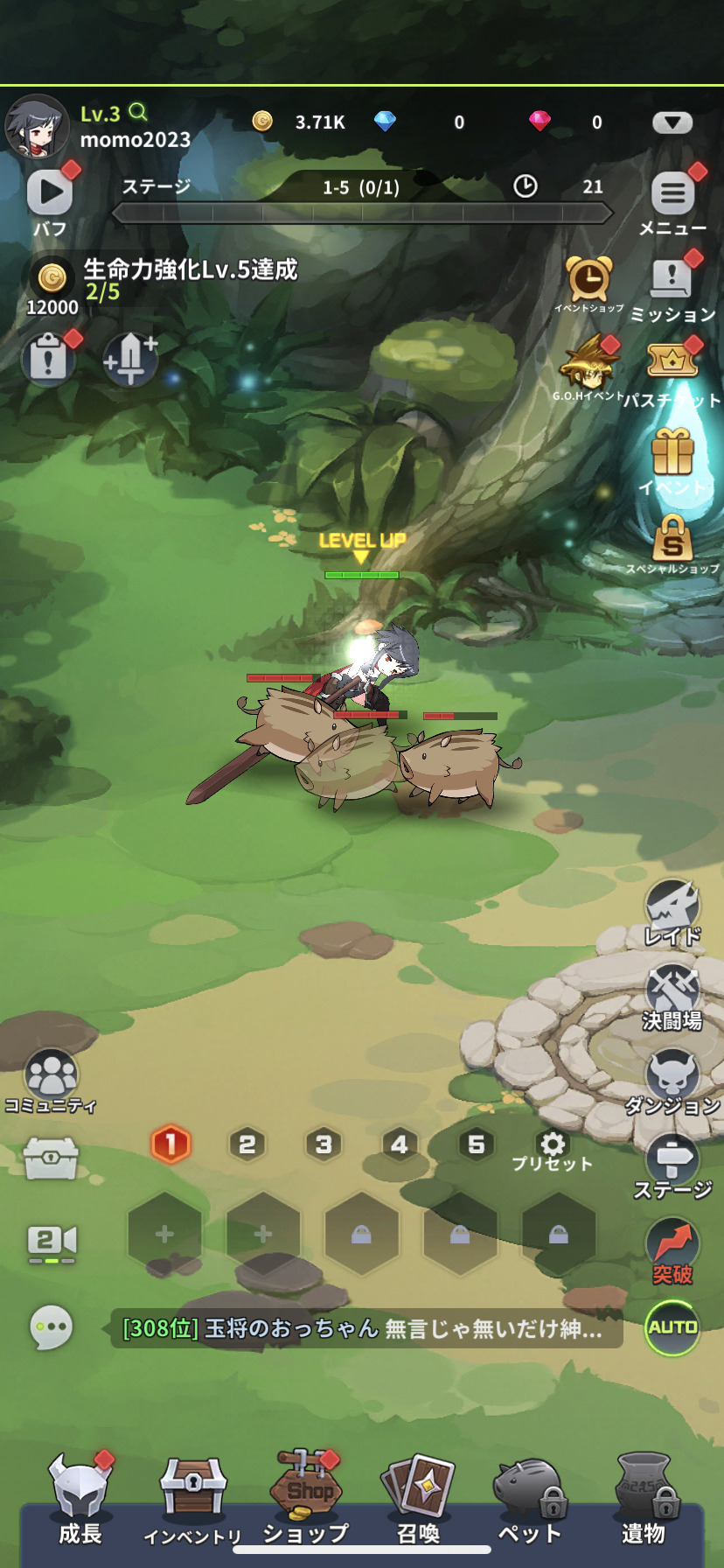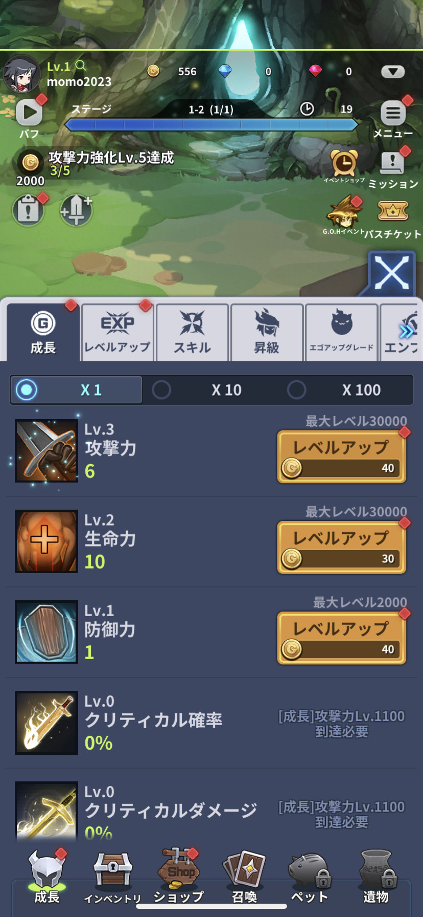 レベルアップも1レベルごとでなく、×10や×100など、一気にレベルアップできる仕組みがあり、良いと思いました。