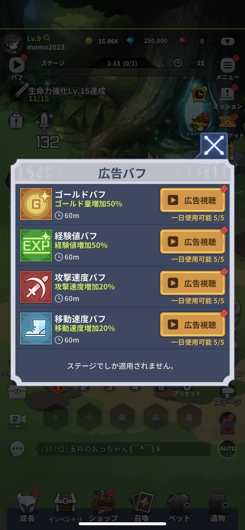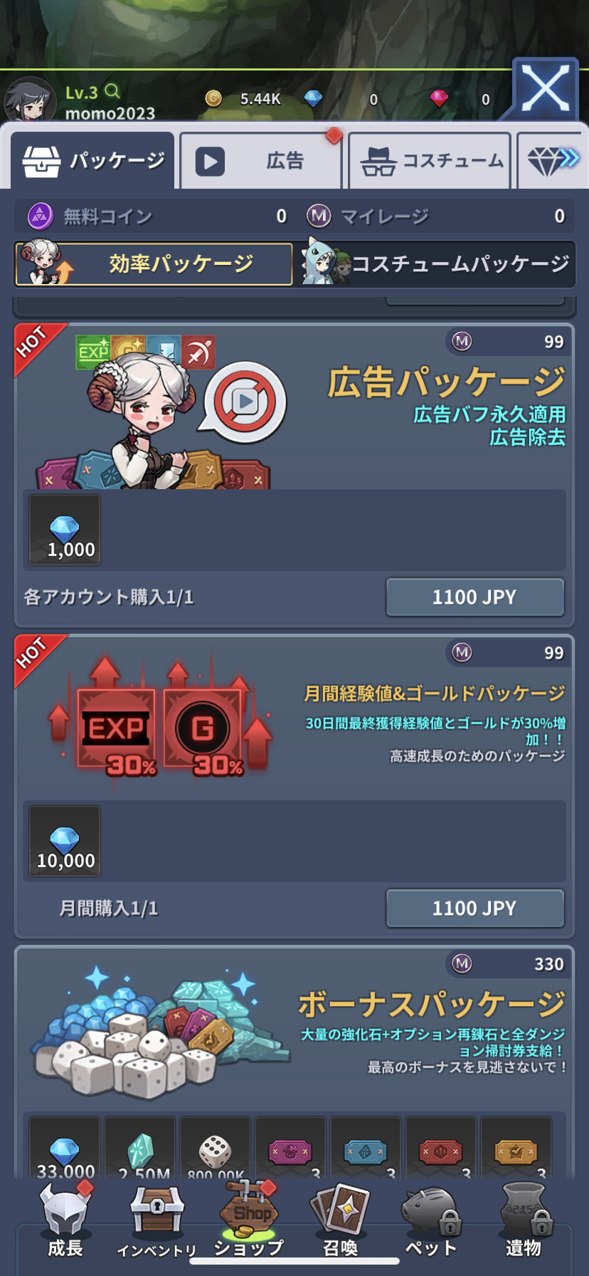 もし広告を見るのが嫌になったら、効率パッケージにある、広告パッケージを利用すると良いですよ!1100円で広告バフが永久適用されます。