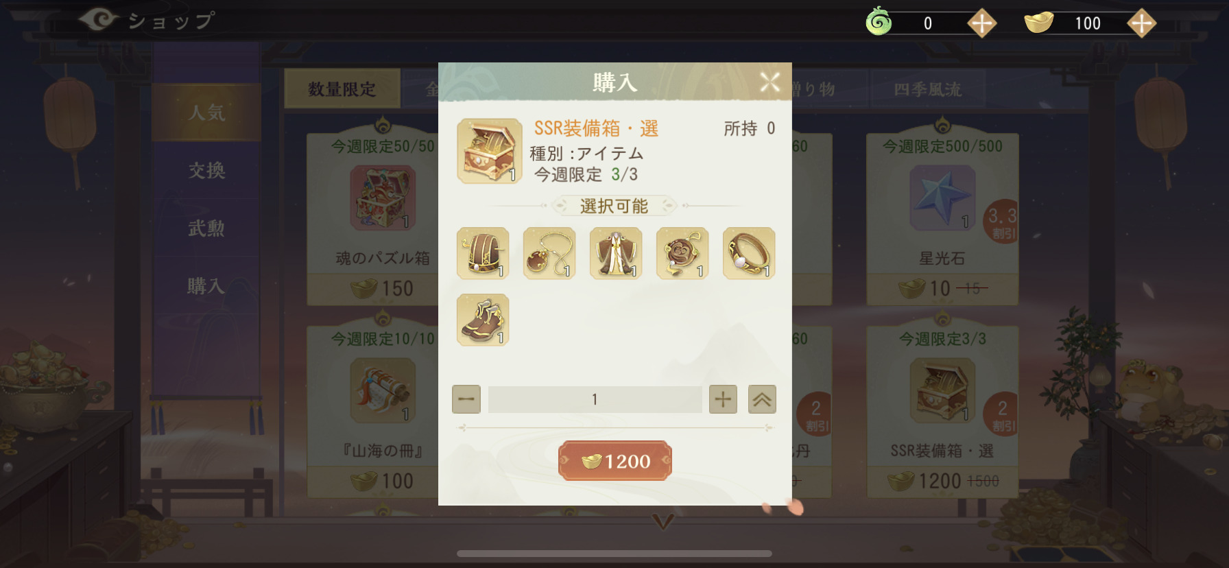 個人的には、「SSR装備箱・選」を購入しようと思っています。1200元宝を要する限定品となっています。「SSR装備箱・選」では、豪華な装備アイテムを選んでGETすることができます。