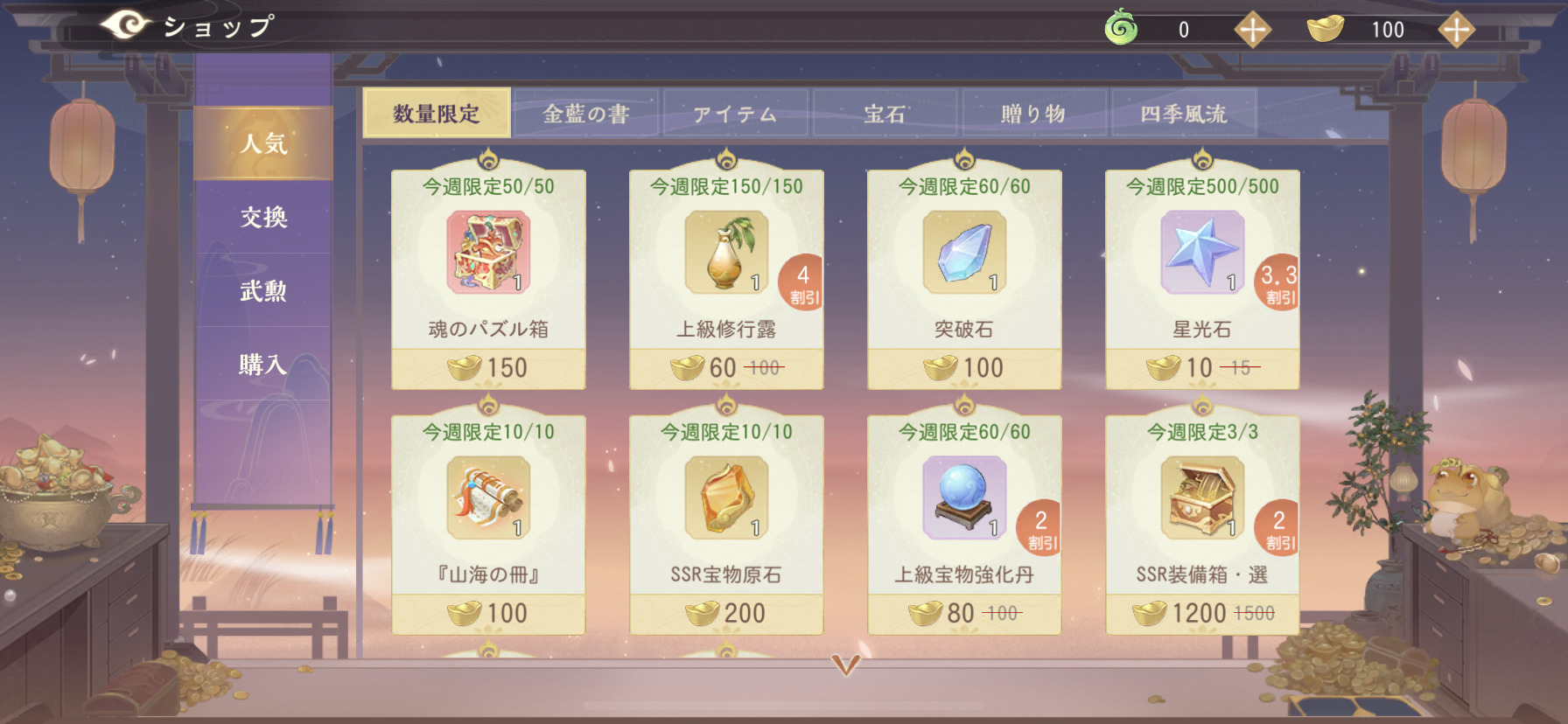 『青雲の契り』では、ショップの人気スペースに、お得な限定品がたくさん用意されていますよ!割引表示のあるものを狙うと良いですよ!2割引や4割引なんてものもあります!