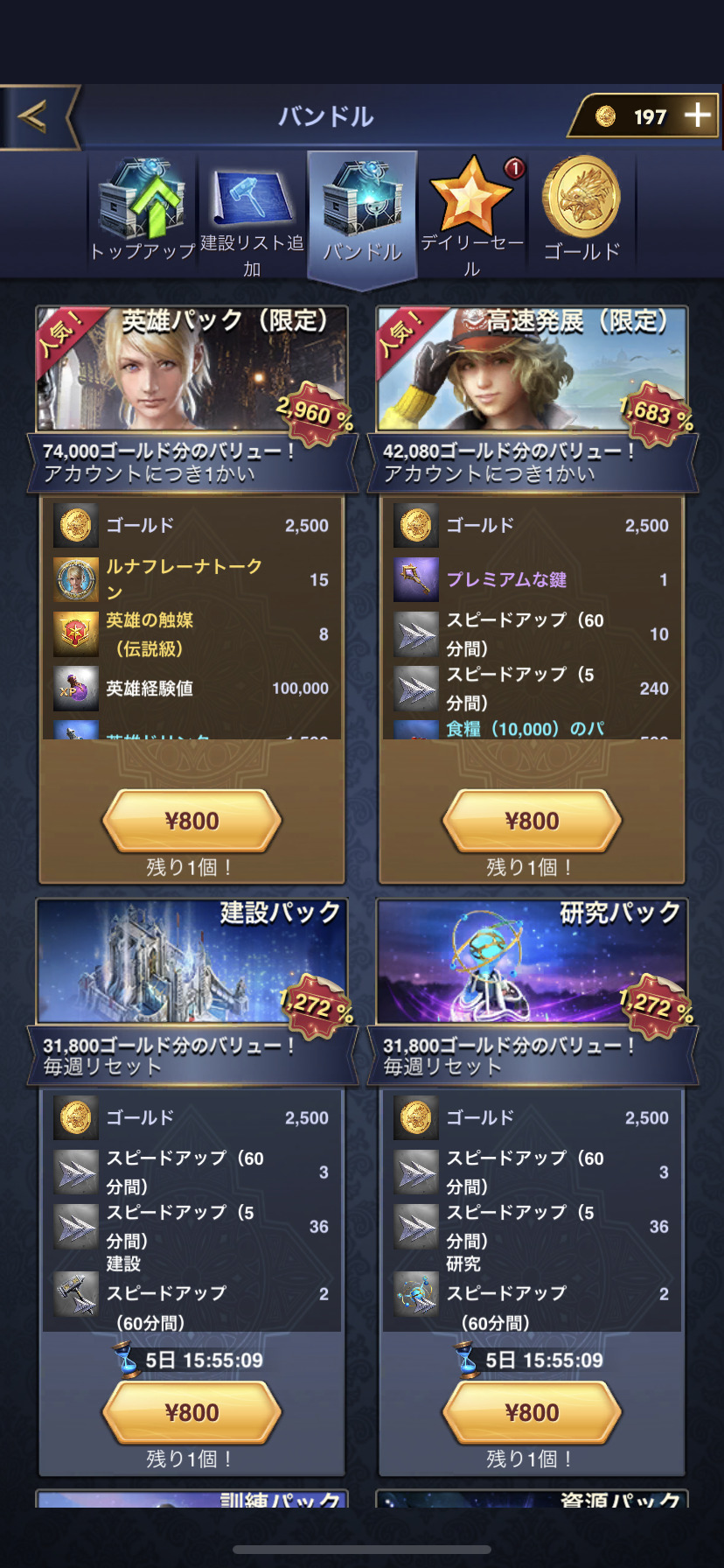 人気なのは英雄パック(限定)と高速発展(限定)です。