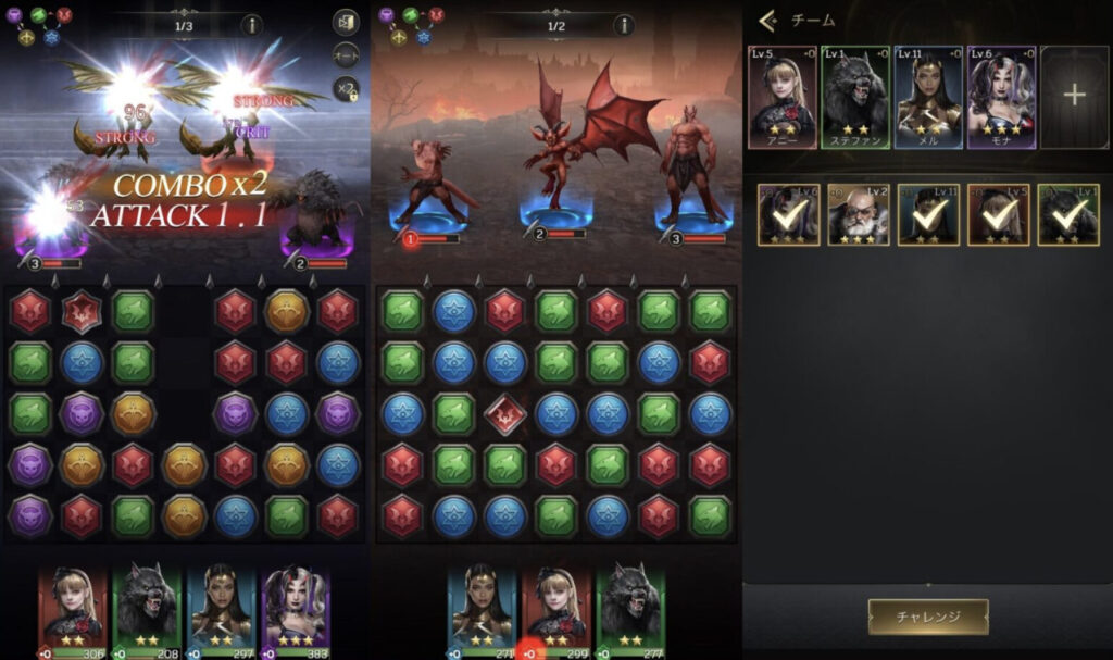 とてもシンプルで簡単なパズルなんですが、パズルの色と出陣する英雄の属性が連動しており、英雄の強さによって攻撃力が変化するため、